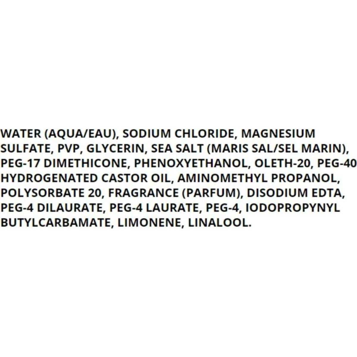 Formulated with Dead Sea Salt to create grip and texture for a beachy, sea spun finish, Styling Polymer that gives flexible hold and control while protecting hair against humidity and frizz, and Glycerin that binds moisture inside the hair fibre for deep hydration.