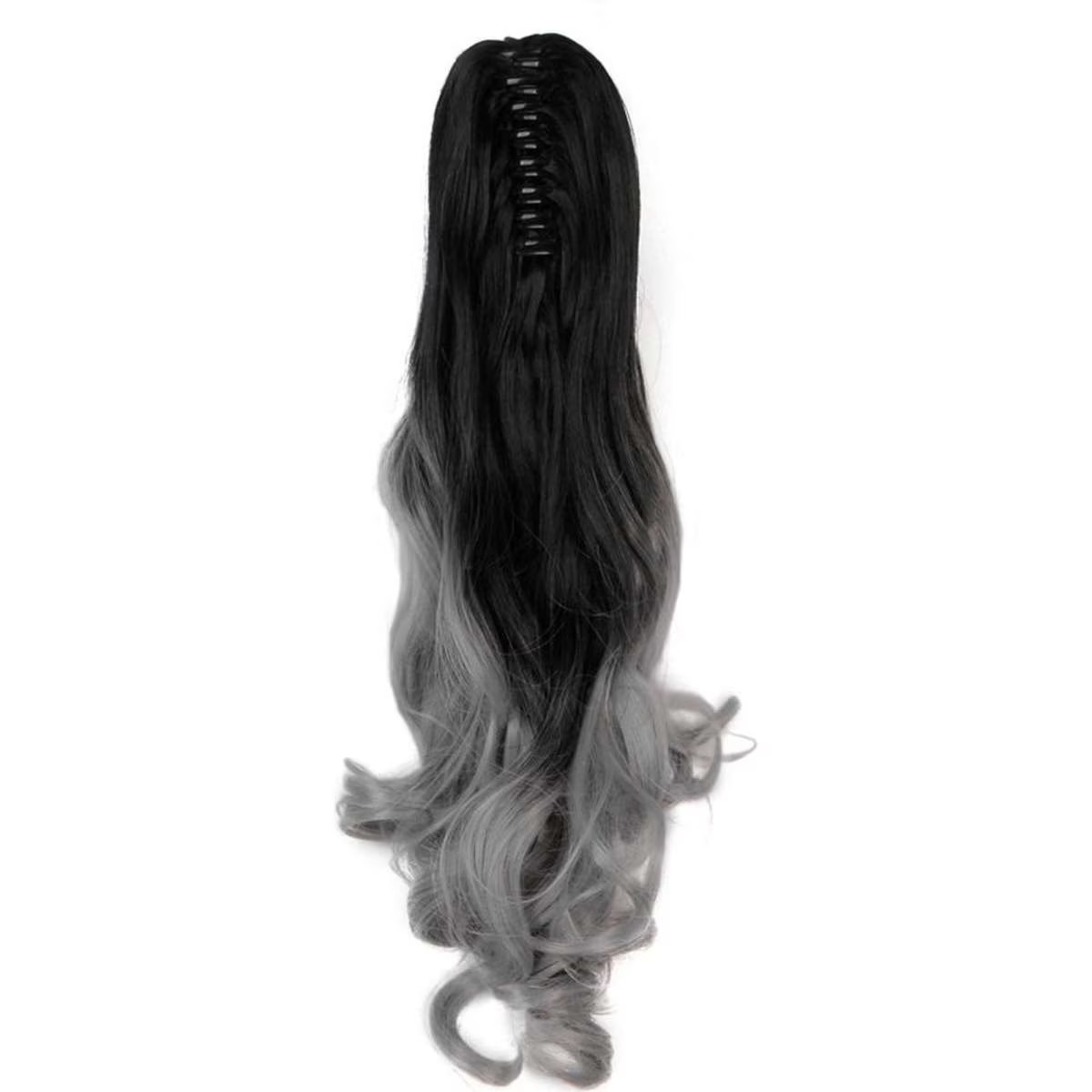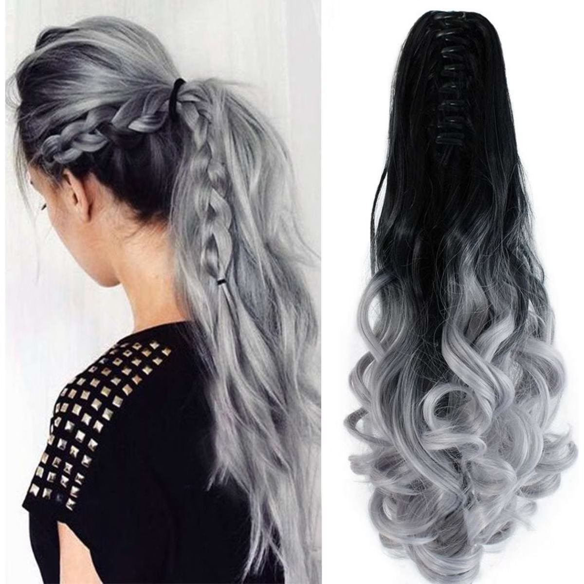 TODO Two Tone Ombre High Grade Silver Gray Curly Clip On Pony Tail 24″ Hair Clamp 09
