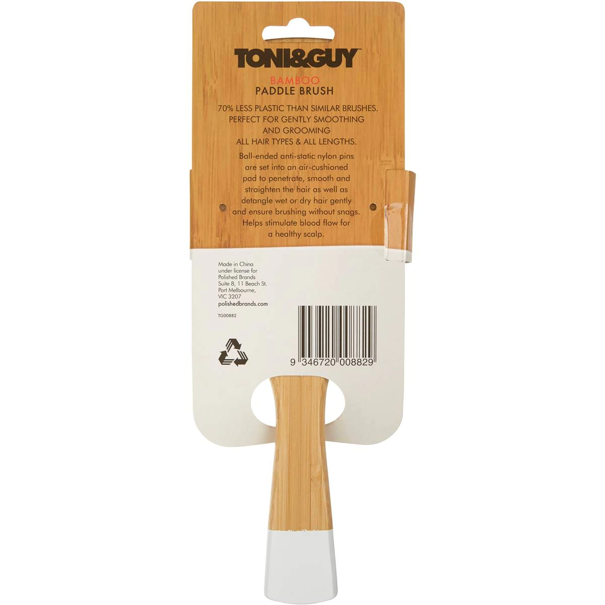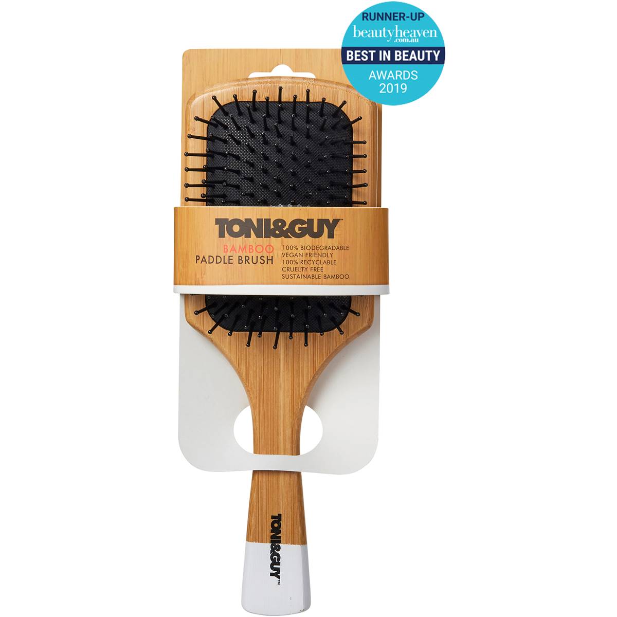 TONI&GUY Bamboo Brush Collection Paddle Brush is a hair brush with 70 per cent less plastic than similar brushes. Ball-ended anti-static nylon pins are set into an air-cushioned pad to penetrate, smooth and straighten the hair, as well as to detangle wet or dry hair gently while ensuring snag-free brushing. Suitable for all hair types. 100 per cent biodegradable, 100 per cent recyclable, vegan friendly, cruelty-free and made from sustainable bamboo.