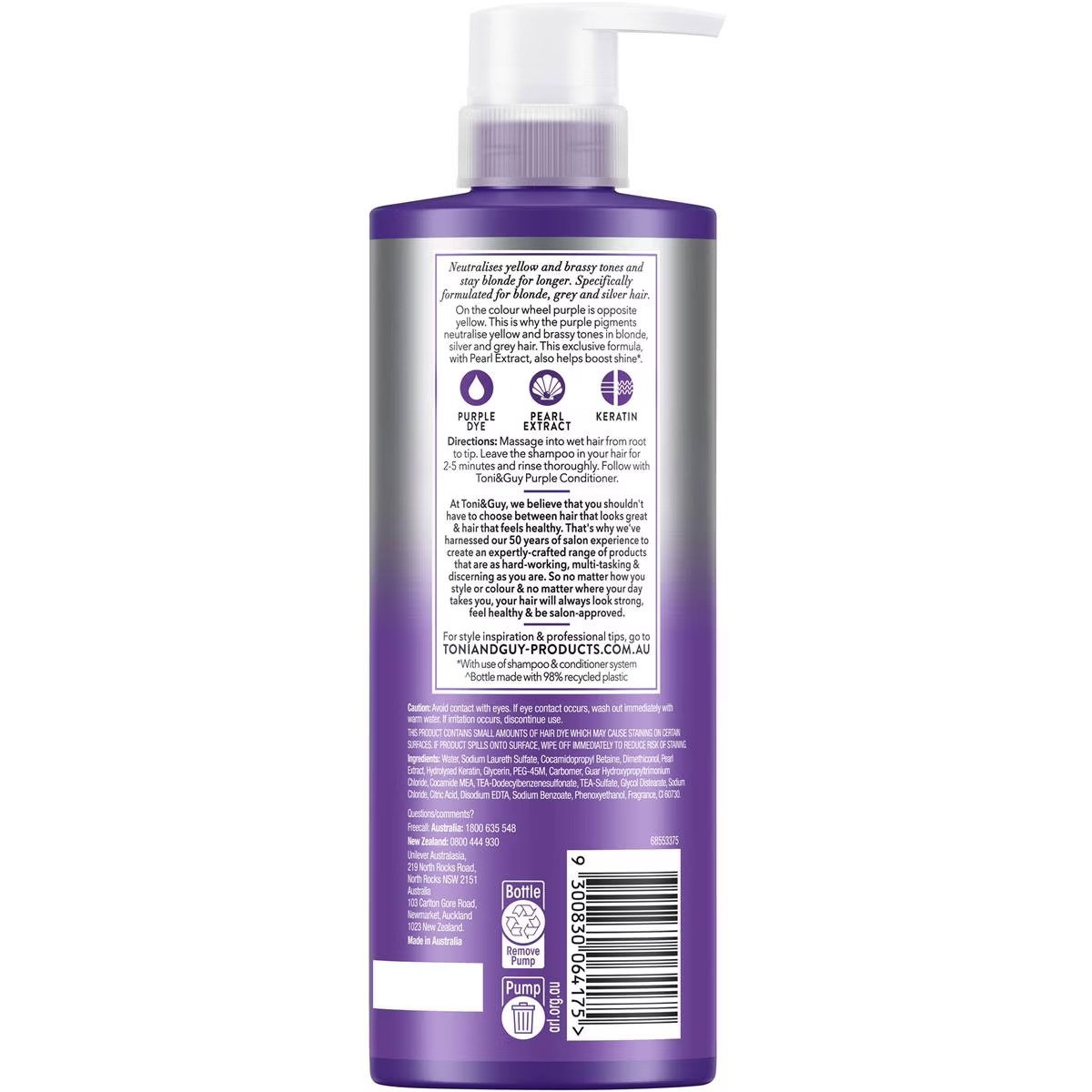 TONI&GUY Purple Shampoo and Conditioner system fights against brassy hair tones and brightens bleached hair. It has a brilliant effect on unruly hair and will leave hair shiny and soft. The violet dye helps colour correct yellow and brassy hair tones and helps keep your hair vibrant and shiny. On the colour wheel, purple is opposite yellow. This is why purple pigments neutralise yellow and brassy tones in blonde, silver and grey hair. This exclusive formula, with Pearl Extract, also helps boost shine.^ Massage onto wet hair from root to tip. Leave in your hair for 2-5 minutes and rinse thoroughly. For greater results, follow with TONI&GUY Purple Conditioner. At Toni&Guy, we believe that you shouldn’t have to choose between hair that looks great & hair that feels healthy. That’s why we’ve harnessed our 50 years of salon experience to create an expertly crafted range of products that are as hard-working, multitasking & discerning as you are. So, no matter how you style or colour your hair & no matter where your day takes you, your hair will always look strong, feel healthy & be salon approved. Strengthen, refresh, hydrate, nourish or moisturise with our wide range of hair care products. We would love to hear your thoughts! If you enjoyed using this product, please share a review. For style inspiration & professional tips, go to TONIANDGUY-PRODUCTS.COM.AU. ^With Shampoo & Conditioner system.