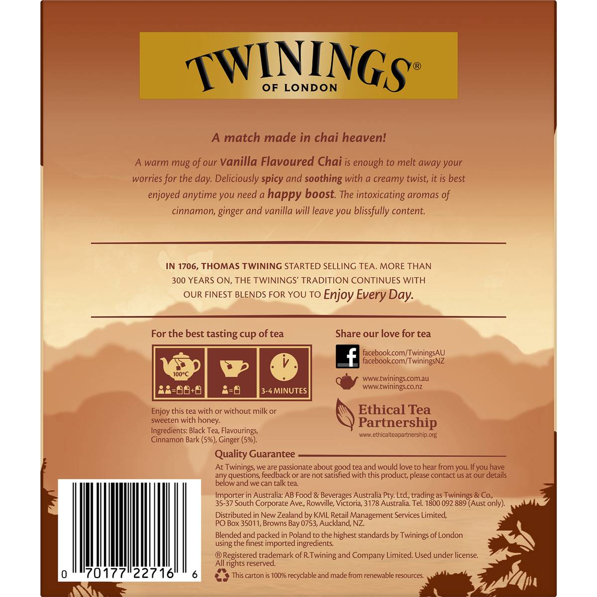 Twinings Vanilla Chai is light strength with spicy and soothing flavour. Enjoy every day.