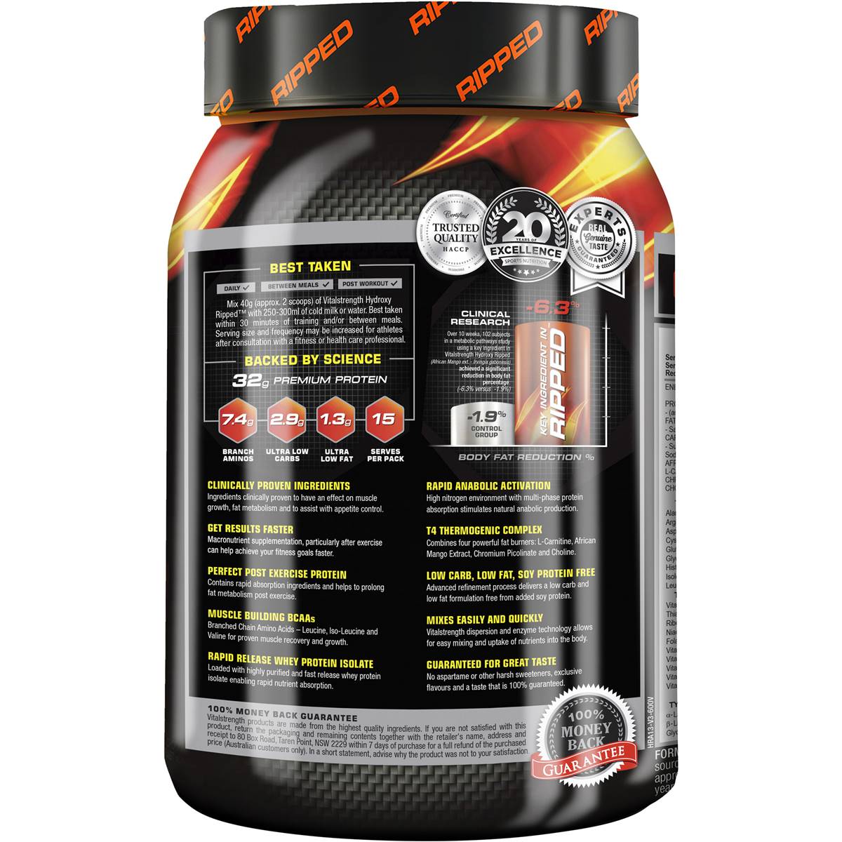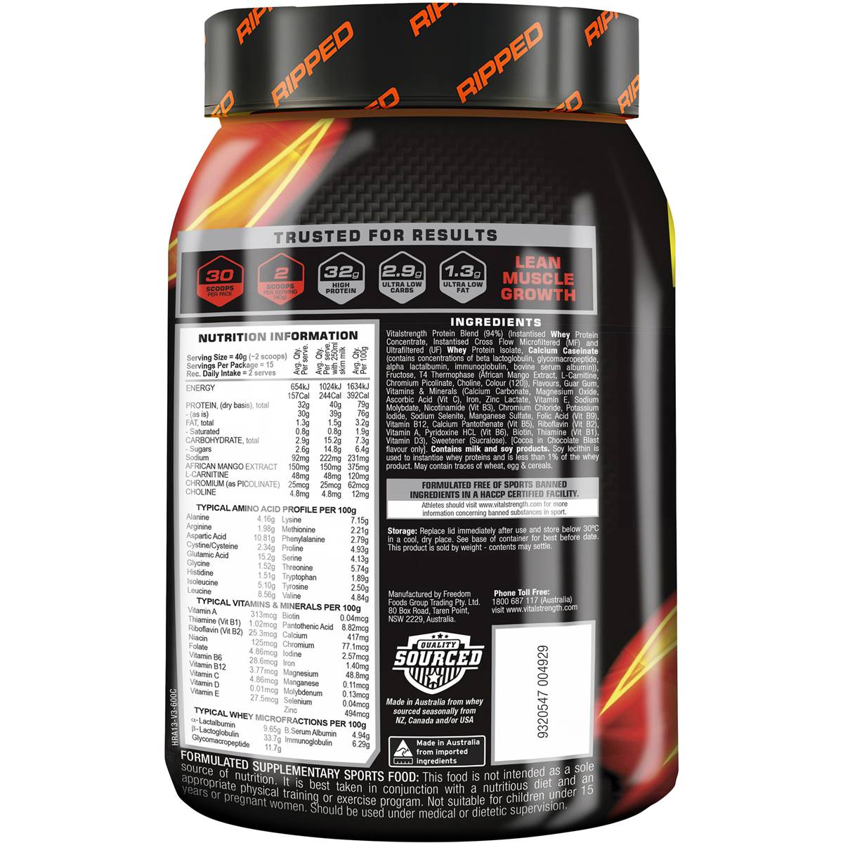 Vitalstrength Protein Blend (94%) (Instantised Whey Protein Concentrate, Instantised Cross Flow Microfiltered (MF) and Ultrafiltered (UF) Whey Protein Isolate, Calcium Caseinate (contains concentrations of beta lactoglobulin, glycomacropeptide, alpha lactalbumin, immunoglobulin, bovine serum albumin)), Fructose, T4 Thermophase (African Mango Extract, L-Carnitine, Chromium Picolinate, Choline, Colour (120)), Flavours, Guar Gum, Vitamins & Minerals (Calcium Carbonate, Magnesium Oxide, Ascorbic Acid (Vit C), Iron, Zinc Lactate, Vitamin E, Sodium Molybdate, Nicotinamide (Vit B3), Chromium Chloride, Potassium Iodide, Sodium Selenite, Manganese Sulfate, Folic Acid Vit B9 , Vitamin B12, Calcium Pantothenate (Vit B5), Riboflavin Vit B2 , Vitamin A, Pyridoxine HCL (Vit B6), Biotin, Thiamine (Vit B1 , Vitamin D3), Sweetener (Sucralose). [Cocoa in Chocolate Blast flavour only].