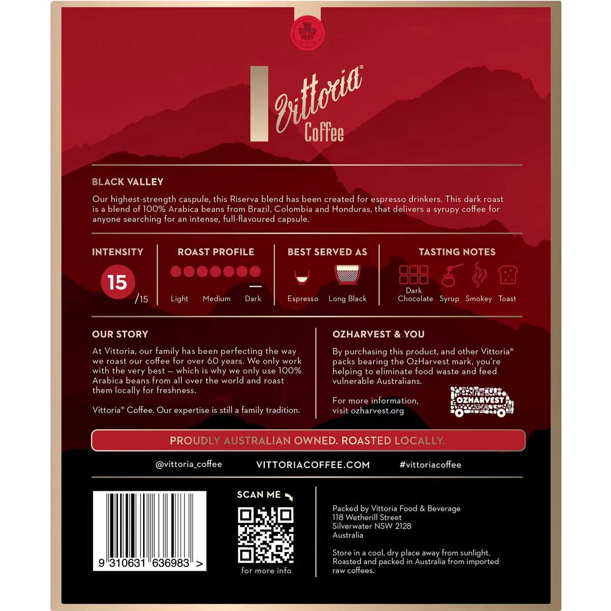 By purchasing this product and other Vittoria packs bearing the OzHarvest mark you’re helping to eliminate food waste and feed vulnerable Australians. For every kilo of coffee prepared for this pack, Vittoria donates $1 to OzHarvest which enables them to deliver two meals to people in need.